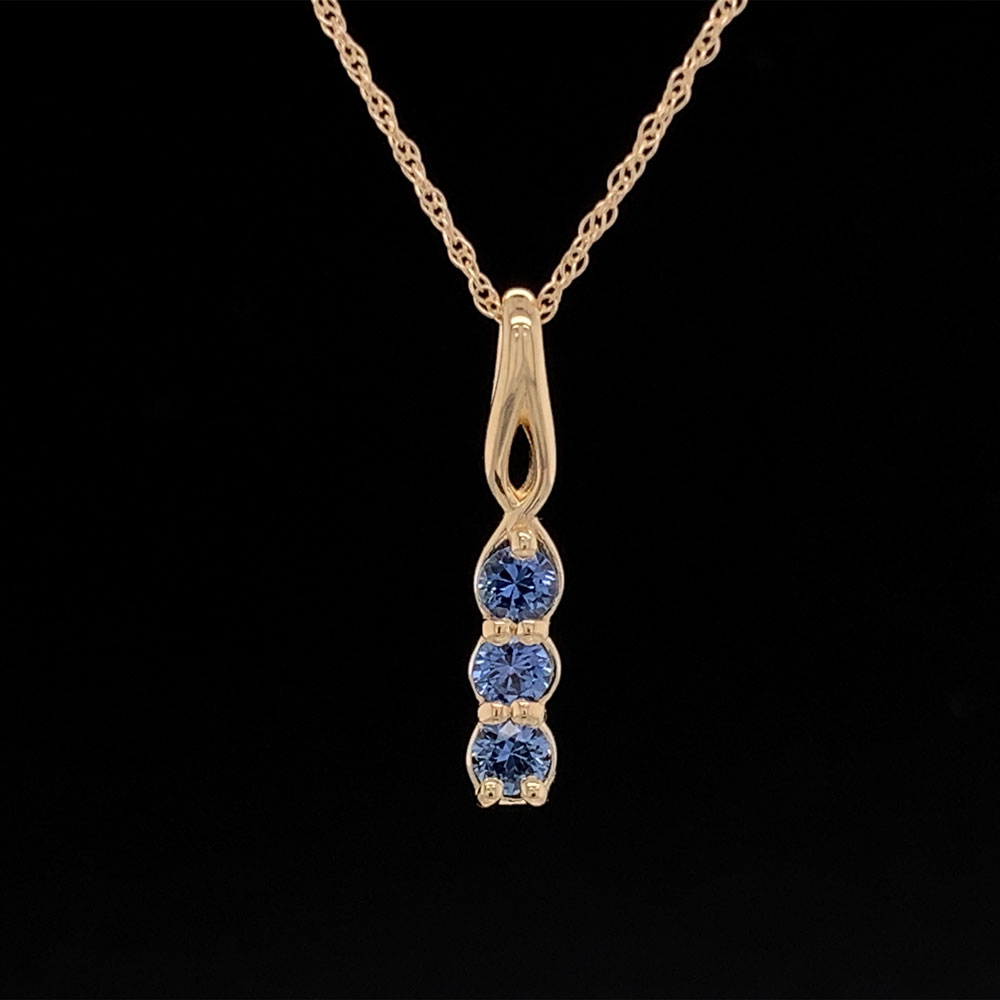 Petite Yellow Gold Three Stone Yogo Sapphire Pendant Geralds Jewelry Oak Harbor, WA