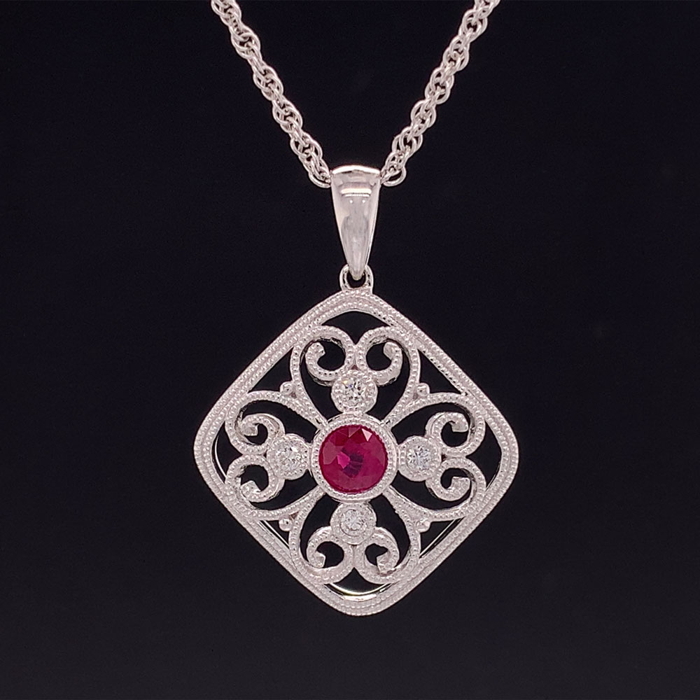Ruby And Diamond Pendant With Milgrain Detail Geralds Jewelry Oak Harbor, WA